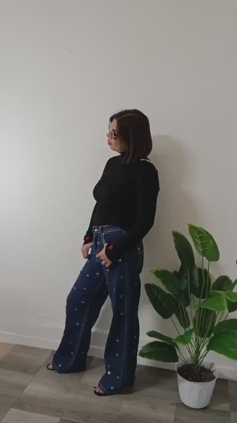Maglia in tessuto morbido e confortevole con collo alto, perfetta per creare look sofisticati e versatili. Il design caratterizzato da delicati cuoricini ricamati aggiunge un tocco di eleganza romantica al capo. Ideale da indossare da sola o in abbinamento con altri pezzi della tua collezione, questa maglia nera rappresenta un essenziale must-have per una guardaroba consapevole e raffinato.